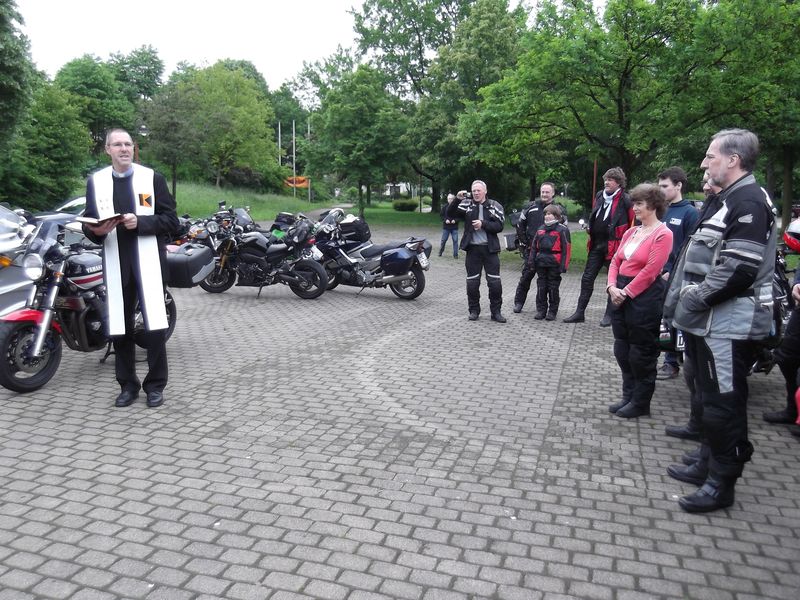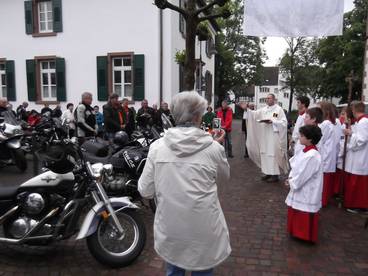 Das Bikertreffen stand dieses Jahr leider nicht unter einem guten Stern. Das Wetter wollte so gar nicht mitspielen. Schon am Anreisetag goß es in Strömen, so dass alle Teilnehmer mehr oder weniger durchnässt ankamen. Die Stimmung litt aber nicht darunter. Beim Nachmittagskaffee und erst recht beim gemütlichen Beisammensein am Abend wurde das Wiedersehen ausgiebig gefeiert. Alle hofften auf den nächsten Tag, an dem die Ausfahrt durch den Schwarzwald stattfinden sollte. Aber leider war das Wetter keinen Deut besser. Ein Teil der Biker fuhren deshalb eine verkürzte Ausfahrt, einige nutzten die Gelegenheit um in Freiburg zu bummeln, nur eine Handvoll Unentwegter machten sich auf die ca. 180 km lange Ausfahrt. Am Spätnachmittag fanden sich dann alle wieder am Treffpunkt ein. In einem großen Korso ging es die letzten 4 km zur Kirche, wo ein Bikergottesdienst gefeiert wurde. Der Abend gehörte dann wieder der Gemütlichkeit, wo bis in die späte Nacht hinein gefeiert wurde. Neben der Verleihung diverser Pokale stimmte man sich schon auf die nächstjährige Ausfahrt ein, die in Warendorf stattfinden wird. Am Abreisetag hatte der Wettergott doch noch ein Einsehen, so daß die meisten trocken nach Hause kamen.