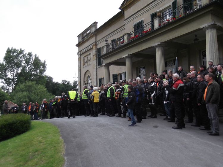 Der Samstag begann dann mit der obligatorischen geführten Ausfahrt durch den Teutoburgerwald zum Schloss Harkotten, bei dem das Mittagessen statt fand. Leider meinte es der Wettergott nicht so gut mit uns Bikern, so daß der Rückweg nach Warendorf von teils strömenden Regen begleitet wurde. Rechtzeitig zur Bikermesse allerdings hatte der Himmel ein Einsehen, so daß der Motorradkorso zur Kirche St. Laurentius zu einem beeindruckenden Schauspiel wurde. Zahlreiche Warendorfer säumten die Strassen um uns zu zu winken. Der Gottesdienst selbst war dann der absolute Höhepunkt des Bikertreffens. Kreisdechant Peters Lenfers zelebrierte den Gottesdienst mit einer beeindruckenden Predigt. Im Anschluss fand dann die Motorradsegnung vor der Kirche statt. so wie wir gekommen waren, so fuhr dann der Korso wieder zur Deula zurück.